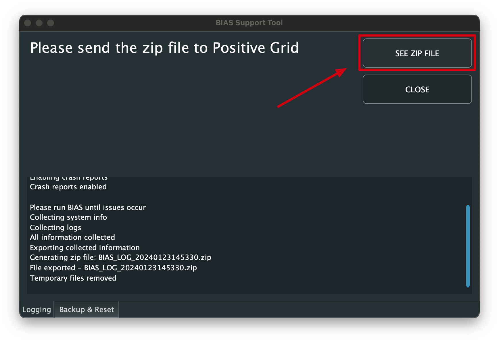 4. Follow the instructions on the Support Tool and send the zip file to our support specialist.