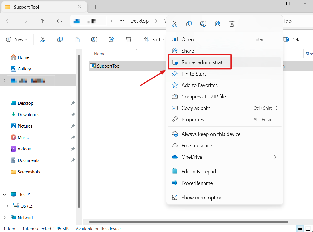 2. Launch the Support Tool by right-clicking on it and selecting "Run as administrator".