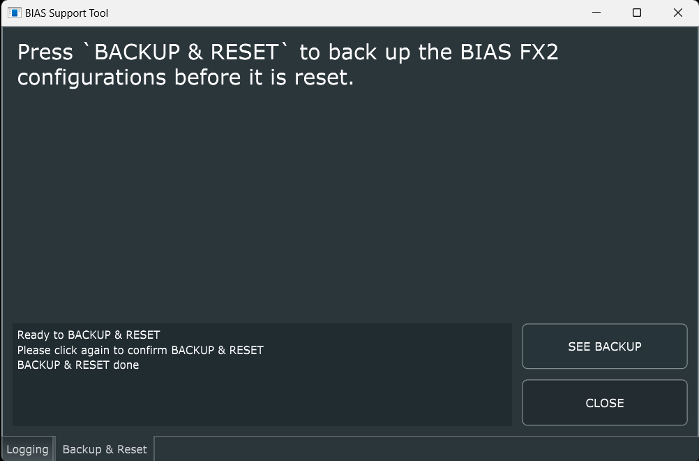This tool, developed by our software engineering team, is designed to collect essential logs from your computer. It can also back up your presets in BIAS FX 2 before resetting BIAS FX 2 on your computer.