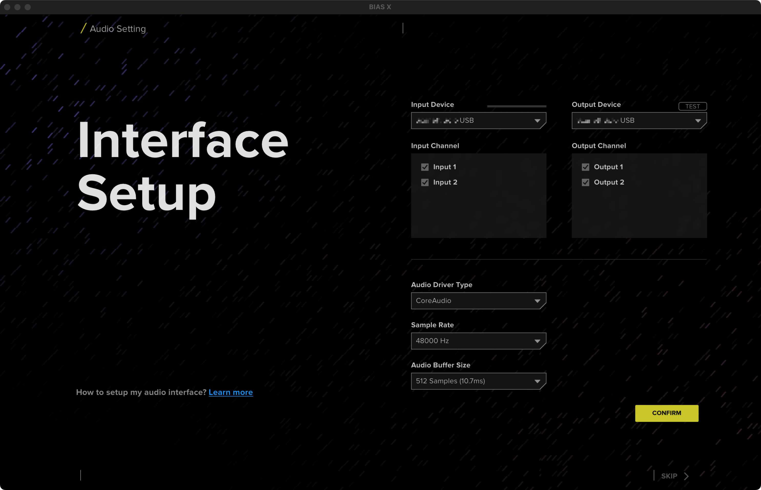 The Audio Settings window will appear automatically when you launch and log into BIAS X for the first time.