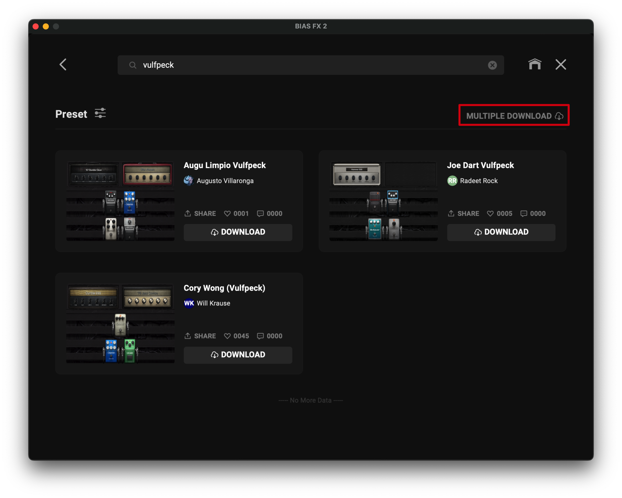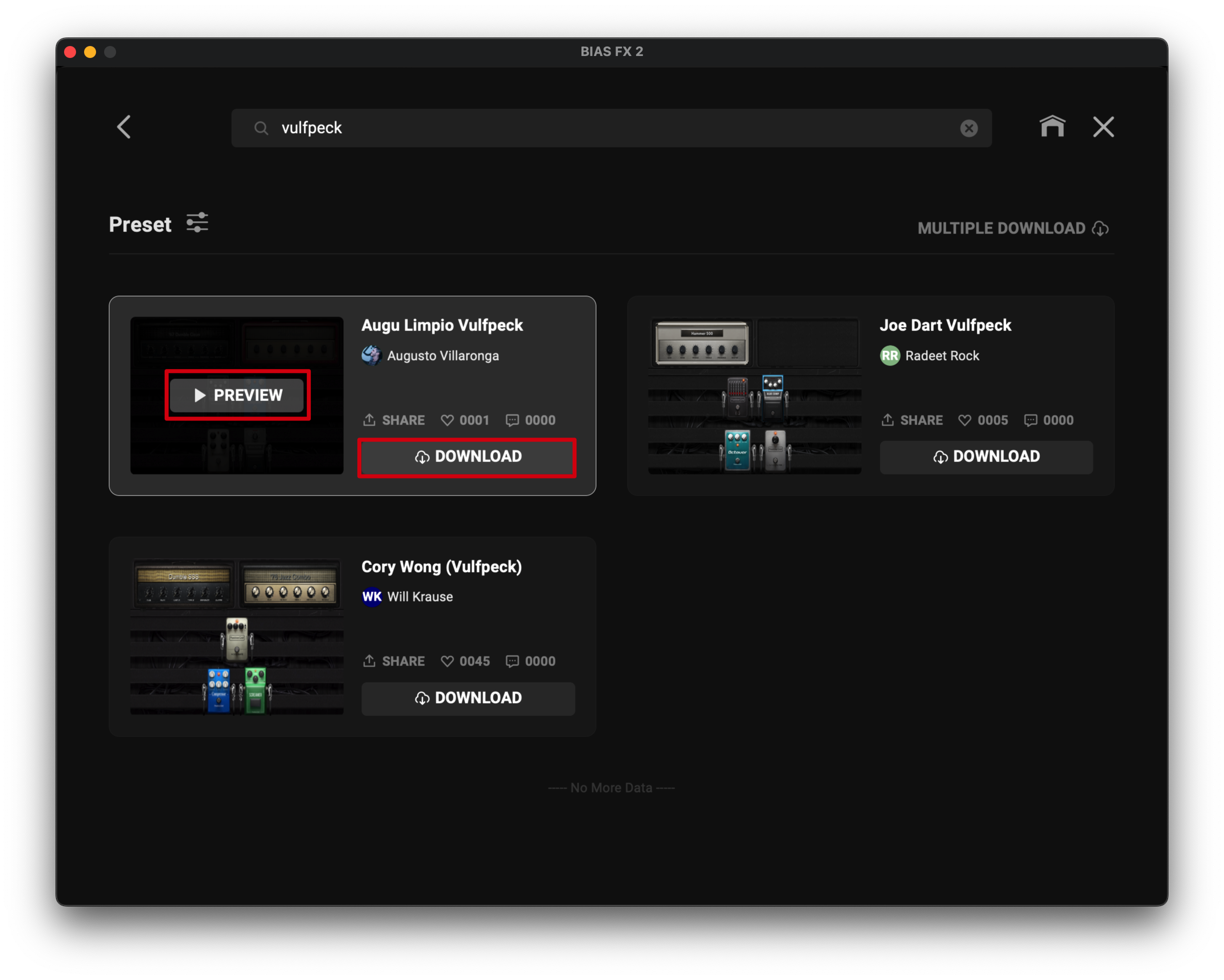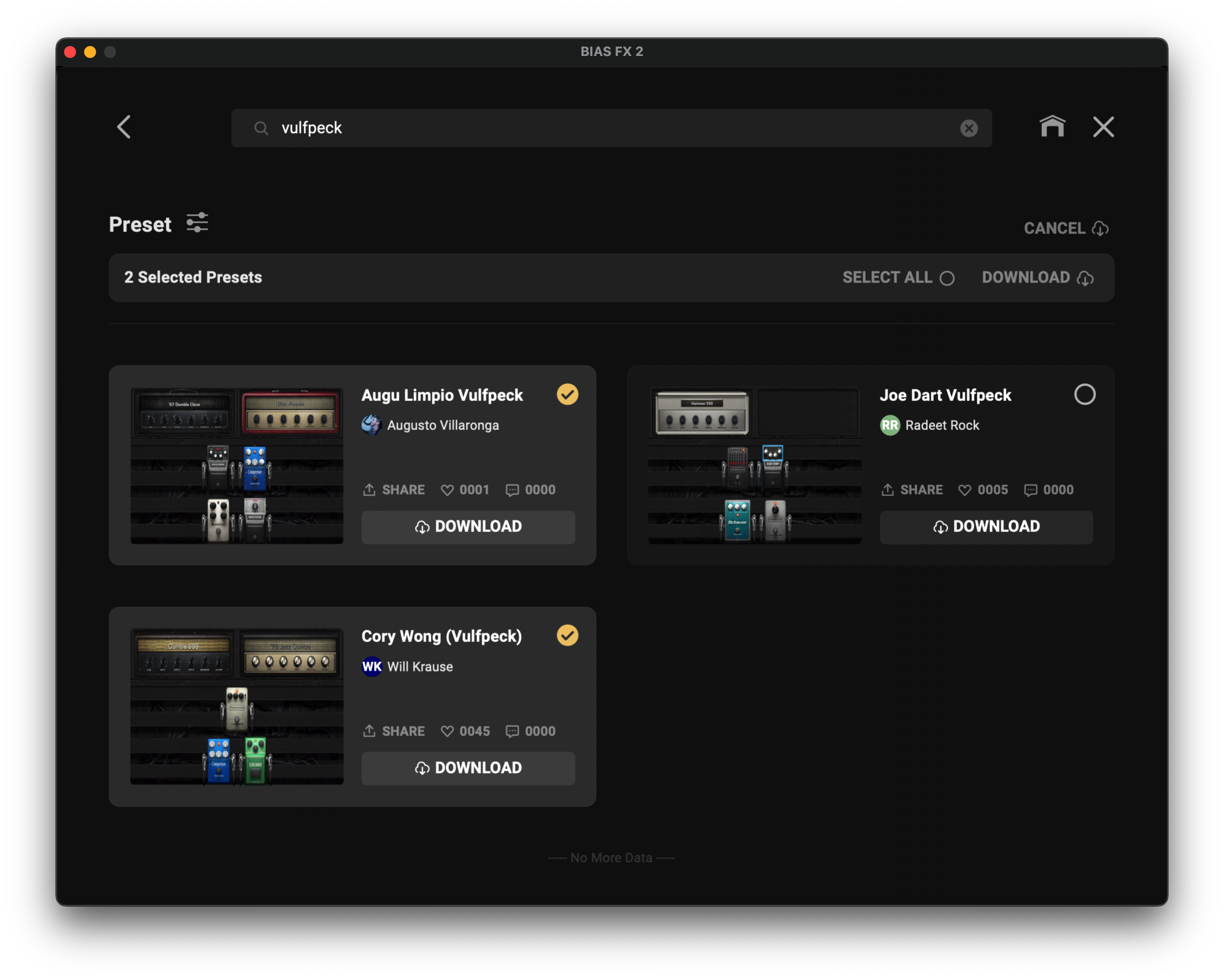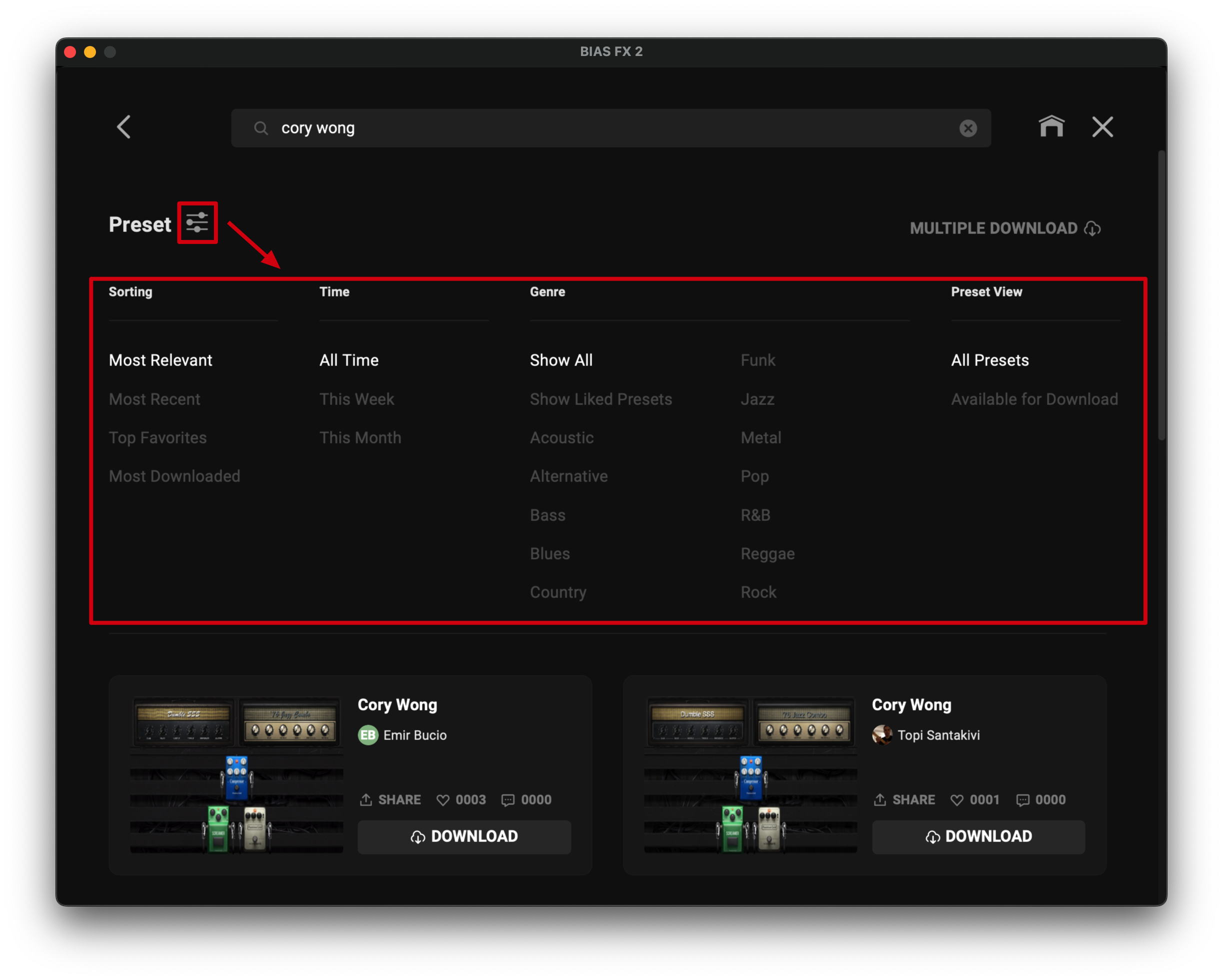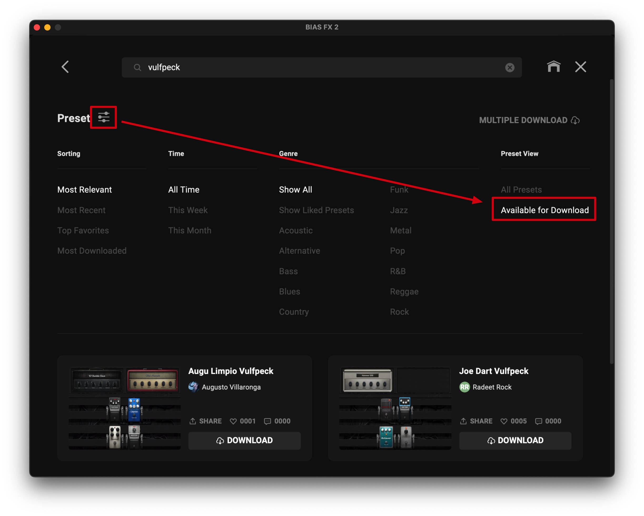 If you want to view only the presets available for the BIAS FX 2 license tier you purchased, search using keywords, then click the settings icon and choose "Available for Download".