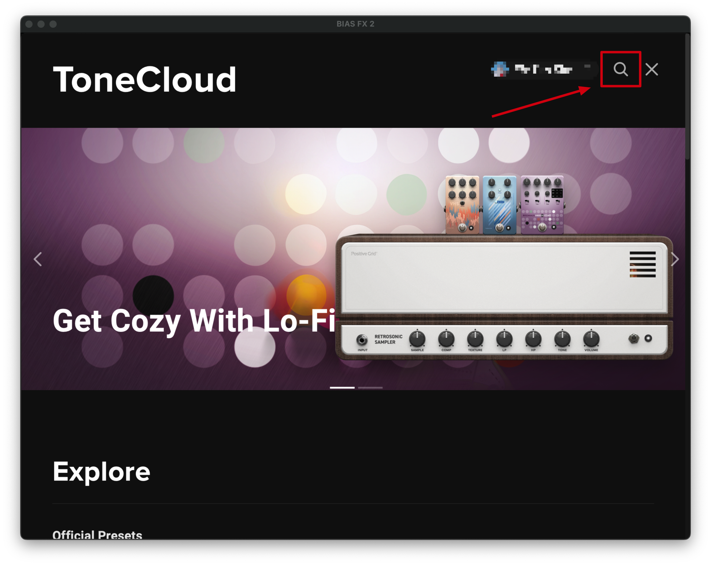 To access ToneCloud, click the icon to the left of the top bar. On the cloud, you'll find thousands of presets. In each block, click icons for corresponding actions such as download, preview, more details, comment, or like. If you wish to download a preset, please ensure you are logged in to your ToneCloud account first.
