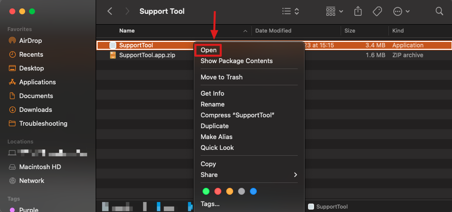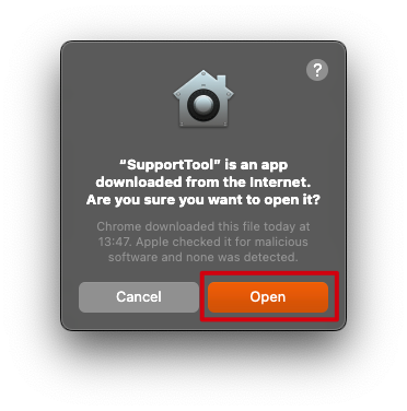 3. Click on "Open" on the pop-up warning to run the Support Tool.