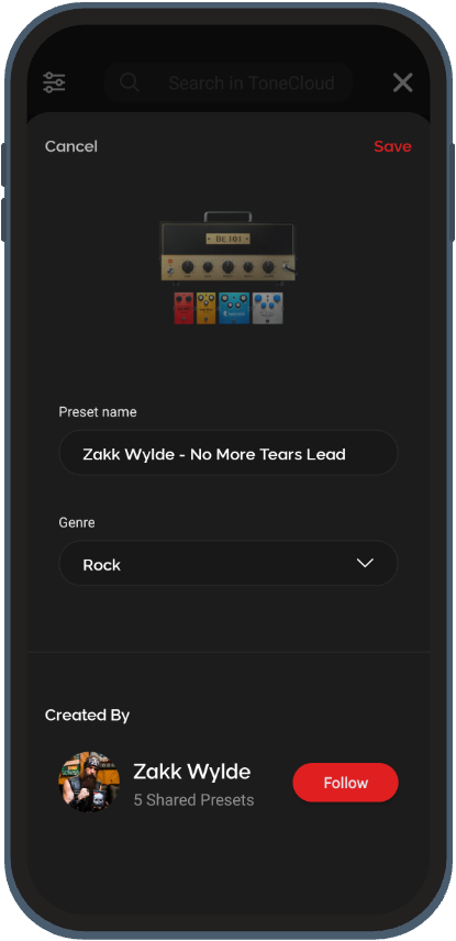 ToneCloud allows you to discover and download presets created by other Spark users—and to share your own. Whether you're looking for a new tone or want to showcase your custom sound, ToneCloud makes it easy.