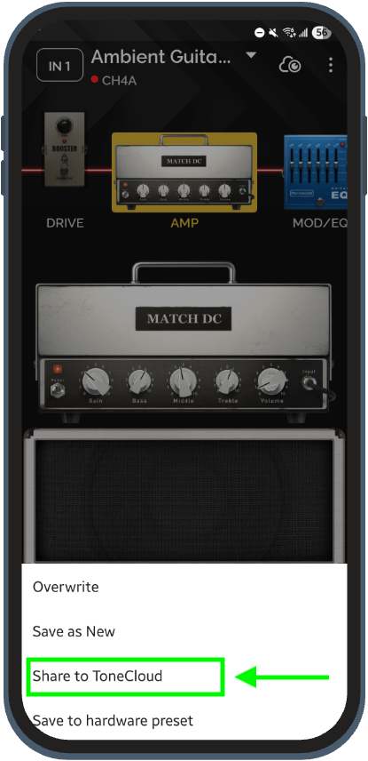 Tap "Share" in the top-right corner to upload your preset to ToneCloud.